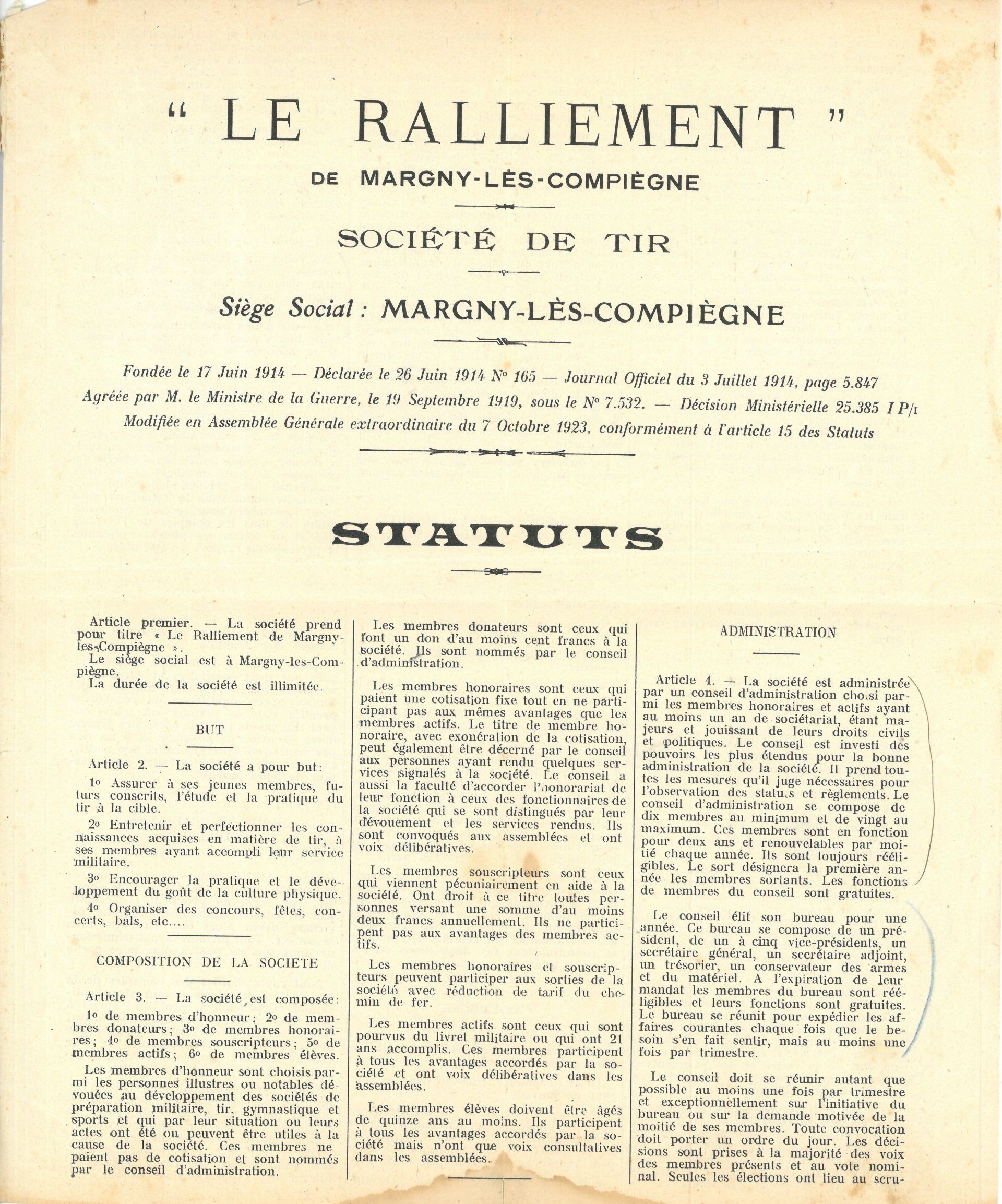Après quelques balbutiements, la Société de Tir « Le Ralliement » ne sera fondée à proprement parlé que le 17 juin 1914, puis déclarée le 26 juin de la même année. Il fut agréée par Monsieur le Ministre de la Guerre de l’époque, Georges Clémenceau, en date du 19 septembre 1919 sous l’intitulé « Le Ralliement » société de préparation militaire, gymnastique et sports.
