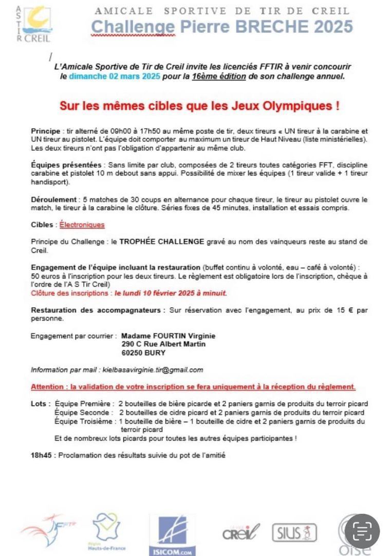 Le Pôle Picard donne rendez-vous aux passionnés de tir sportif pour l’édition 2025 du Ralliement, qui se tiendra du 3 au 5 octobre à Margny-lès-Compiègne. L’événement se déroulera au 653 rue Georges Clémenceau, dans une ambiance conviviale et compétitive. Les participants, répartis en plusieurs catégories (des plus jeunes aux seniors), s’affronteront selon le règlement de l’ISSF et de l’école de tir. Les épreuves se feront sur cibles électroniques SIUS, avec un classement établi sur une série unique de 40 ou 60 coups selon les catégories. Les engagements sont fixés à 12 € pour les adultes (10 € pour les jeunes), et 11 € par étape (9 € pour les jeunes). 📅 Programme Vendredi 3 octobre à partir de 14h Samedi 4 octobre dès 9h Dimanche 5 octobre dès 9h Pour toute information ou inscription, vous pouvez contacter Arnauld Sieuros au 06 50 99 69 56 ou par mail : arnauld_sieuros@yahoo.fr 👉 Que vous soyez compétiteur ou simple curieux, Le Ralliement 2025 promet trois jours intenses autour du tir sportif en Picardie.