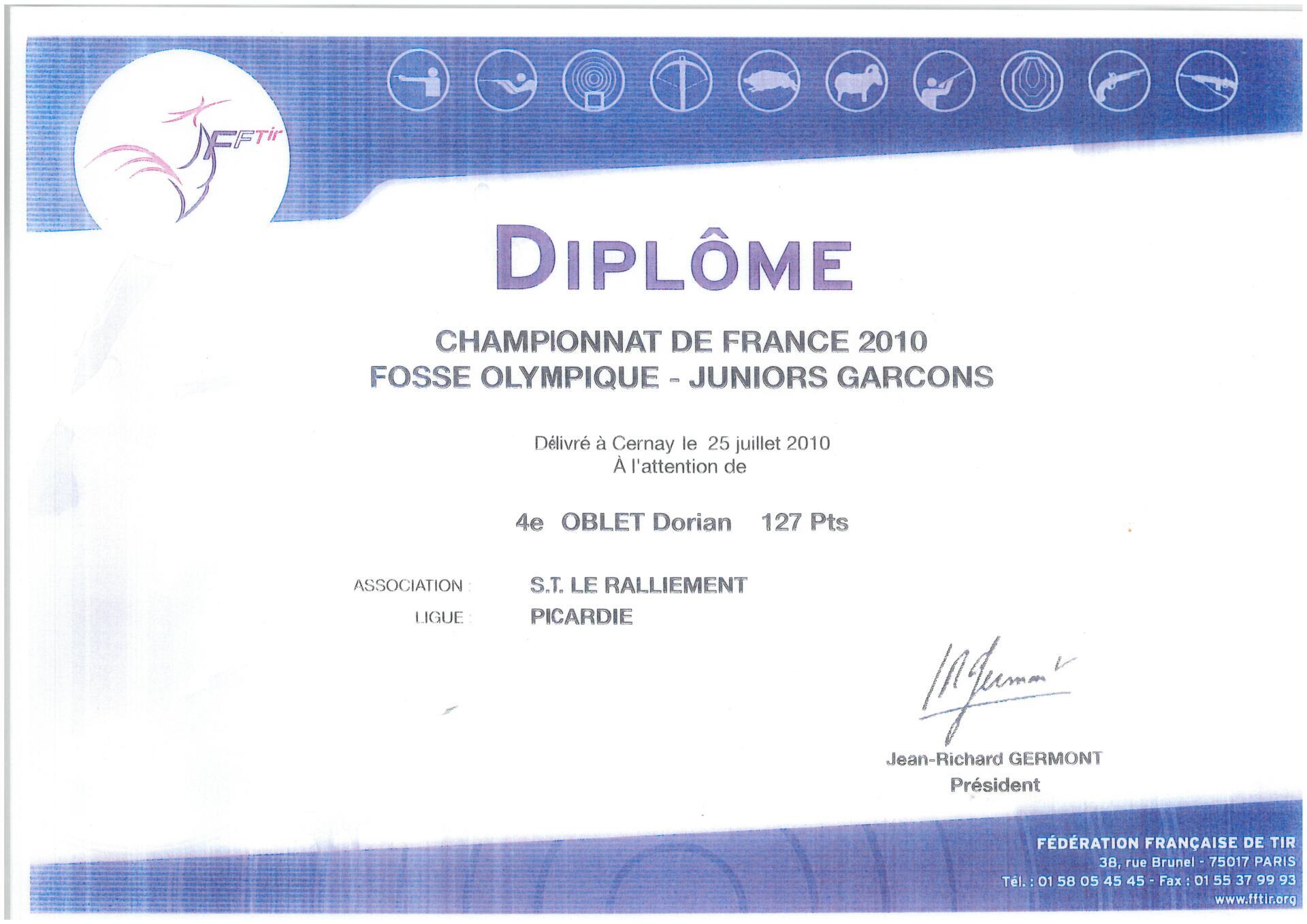 Résultats des Régionaux 10 mètres qui se sont déroulés le week-end dernier à St Quentin. Carabine : Cadets Filles : Camille HECTOR Médaille de bronze avec 605,1 pts, Romane HECTOR 7éme avec 591,4 pts. Juniors Filles : Garance CIRET Vice championne de Picardie avec 598,7 pts. Dames 1 : Alexandra GARCIA 16éme avec 548,1. Dames 3 : Evelyne COMBESSIE 6éme avec 342,6 pts. Senior 1 : Alexandre DAVID Champion de Picardie avec 613,2 pts. Senior 2 : Gilles MEREL 5éme avec 573,2 pts. Pistolet : Dames 1 Antoinette POLLET 7éme avec 501 pts. Senior 1 : Guillaume VERNAECKT 12éme avec 531 pts. Senior 3 : Philippe COMBESSIE 36éme avec 440 pts. Pistolet standard : Senior 1 : Guillaume VERNAECKT Médaille de bronze avec 324 pts. Sont qualifiés pour les Championnats de France : Camille HECTOR, Garance CIRET, et David ALEXANDRE. On va essayer pour Romane HECTOR. Félicitations à nos tireurs pour ces bons résultats et de représenter Le Ralliement dans les compétitions.