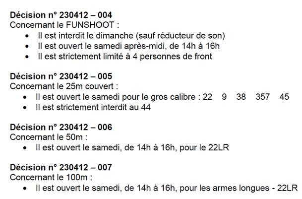 Suite à de nombreuses plaintes formulées par des riverains auprès de la mairie (pour des tirs intempestifs et bruyants en extérieur le dimanche matin) le Comité Directeur s’est réuni le 12 avril 2023 afin d’envisager des mesures correctives pour éviter tout conflit avec la commune et éviter la fermeture totale des stands extérieurs le dimanche.